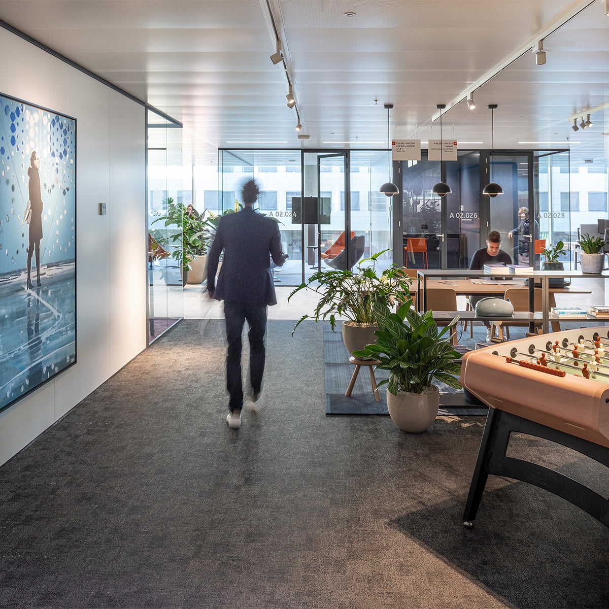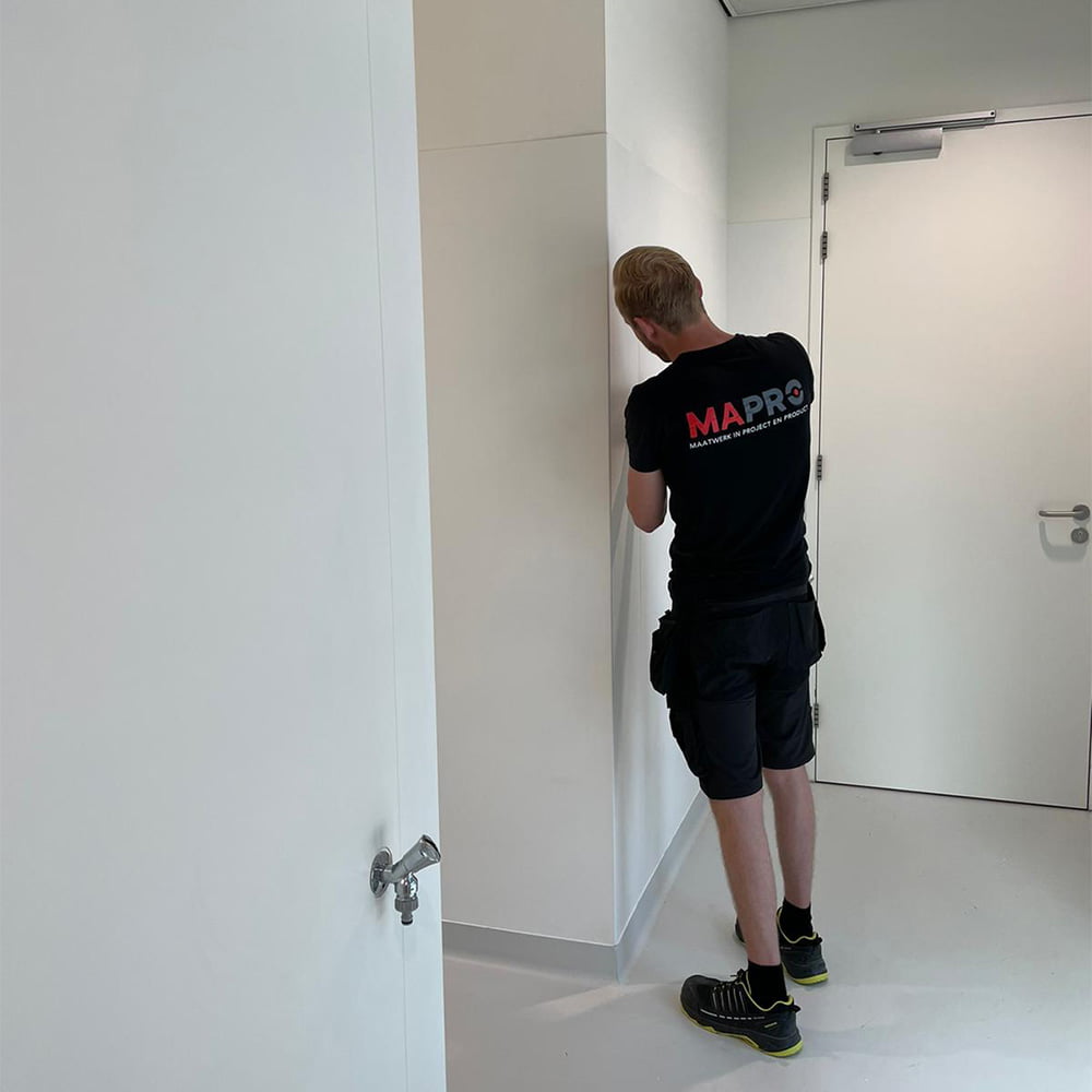 Begin 2021 zijn we voor het eerst aan de slag gegaan in het hoofdkantoor van ING in Amsterdam. Nu konden we verder op andere verdiepingen en is er naast de veelgebruikte kleur Chalk, ook gekozen voor Schist. Dit is een donkergrijze tint, welke mooi aansluit bij de zwarte muren, kozijn en deuren. Net als bij het eerdere project op deze locatie, zijn alle panelen op een hoogte van 180 cm geplaatst. Dit is geen standaard hoogte, want een volledig paneel is 130 x 300 cm. Met 180 cm wordt alle mogelijke impact, krassen en stoten opgevangen.