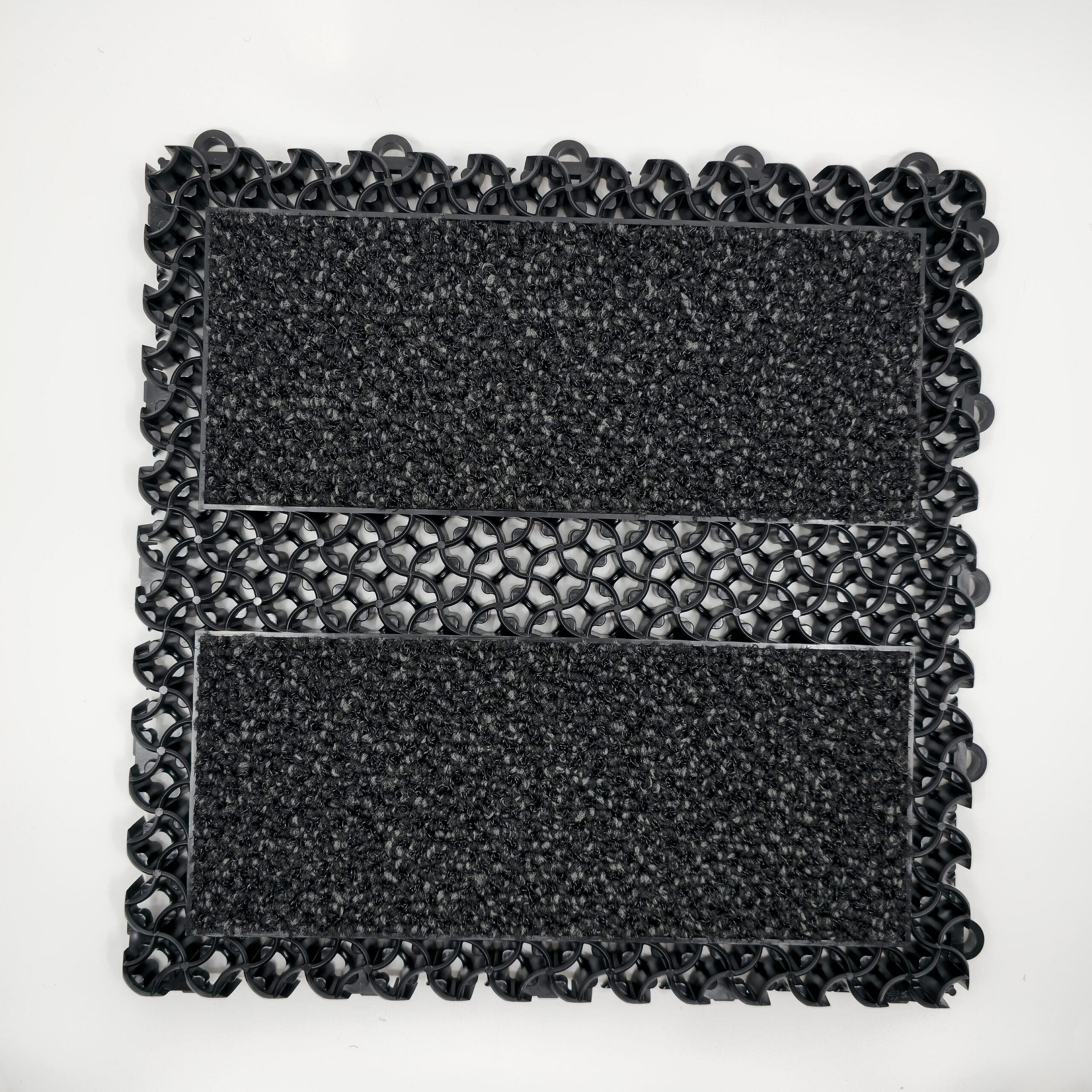Unieke mat die gemakkelijk te installeren is, door een handig kliksysteem. Bestaande uit tegels van 30 x 30 cm met de keuze uit alleen de schrapende vorm of met een droogloop vlak.