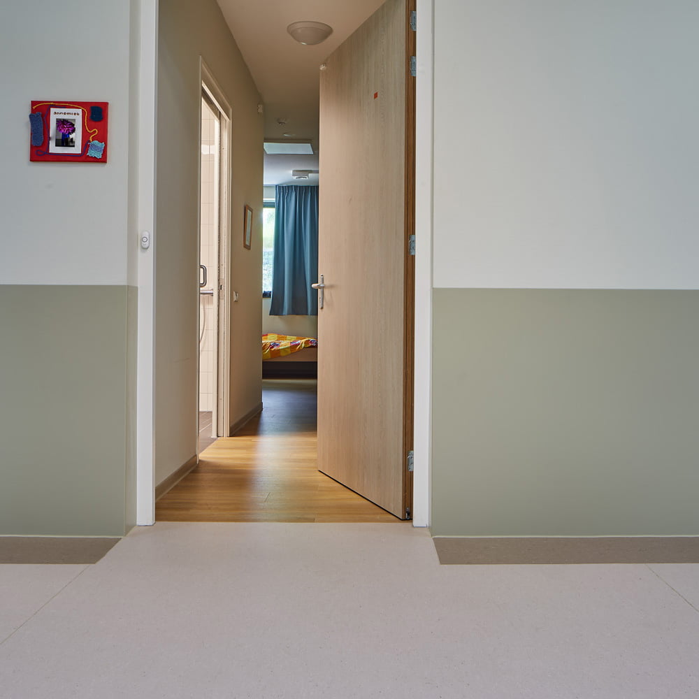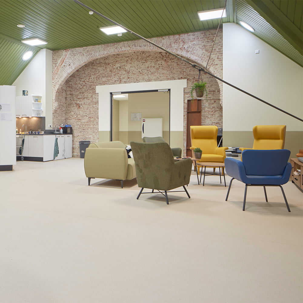 Gerflor heeft voor dit project de vloer en de wandbescherming geleverd en dat laatste hebben wij geïnstalleerd. Er is gekozen voor de kleur Greige, deze harmonieert mooi met de vloer en andere interieur elementen van het gebouw.