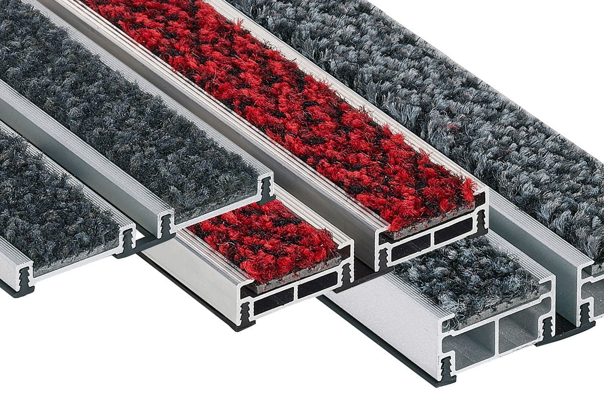 Het Romat assortiment bestaat uit profielen in massief aluminium waarin speciaal ontwikkelde vuilwerkende tapijtstroken en rubber zijn geschoven. De profielen zijn met elkaar verbonden door middel van montagebanden in soepel pvc die onder de profielen worden geplaatst, om het geluid van het verkeer te dempen en ervoor te zorgen dat het tapijt gemakkelijk kan worden opgerold.