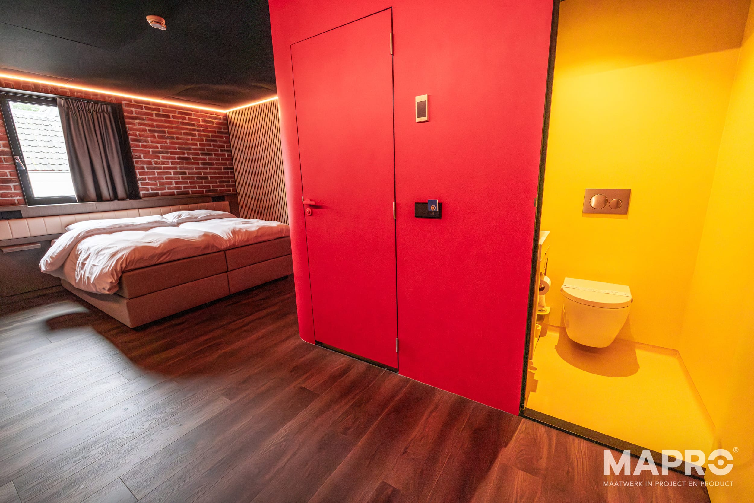 Naast de historie van het pand hadden wij ook te maken met het plaatsen en werken in smalle ruimtes gepaard met bijzondere vormen en uitsparingen. Naast het bekleden van de wanden met Acrosmart Decochoc, maar ook sanitaire ruimten en deuren. De architect heeft gekozen voor felle kleuren die perfect aansluiten bij de stoere, industriële uitstraling van het hotel. De toiletten en badkamers zijn in het Mimosa geel bekleed en de meubels zijn hierop afgestemd.