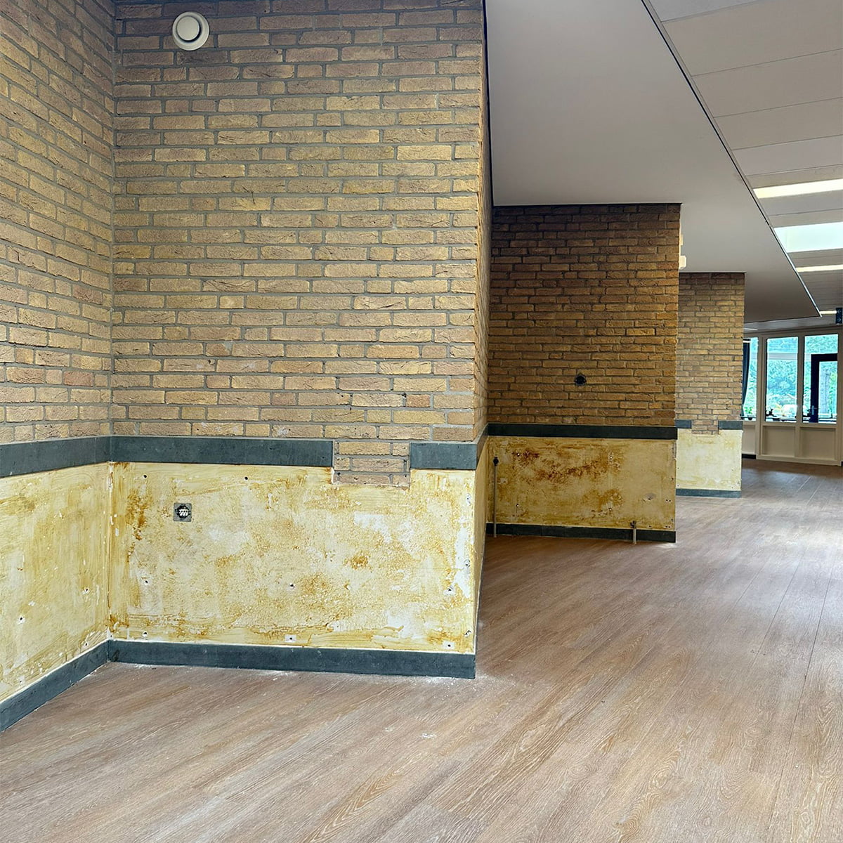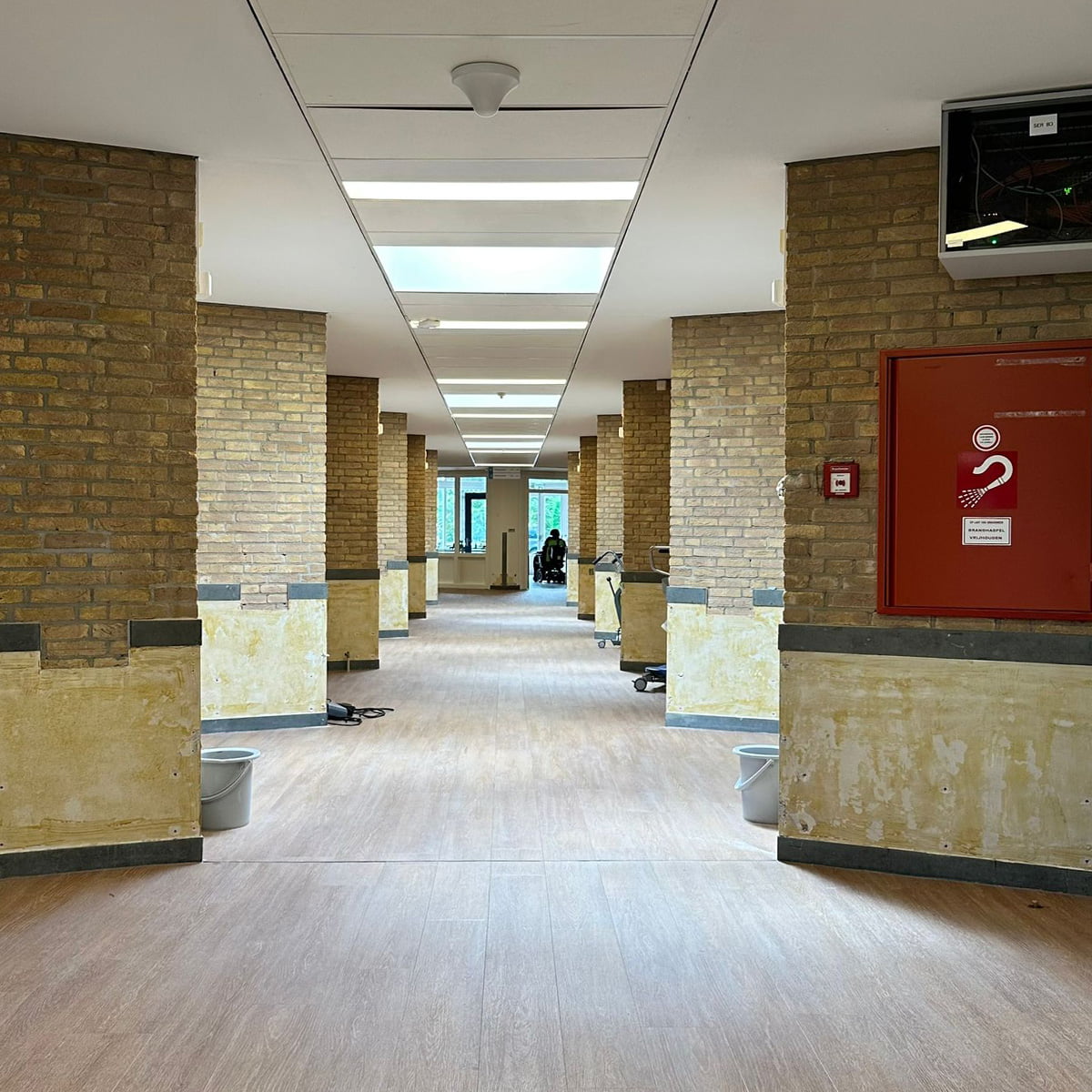 Zorginstelling Nieuw Unicum in Zandvoort wordt in een fris jasje gestoken. De vorige wandbekleding was toe aan vervanging en er is gekozen voor een kwalitatief materiaal. Decochoc van Acrosmart is daarmee de perfecte keuze, deze beschermt de wanden, zijn gemakkelijk schoon te houden en behouden hun kleur. In zorginstellingen kunnen er gemakkelijk beschadigingen aan de wand ontstaan door onder andere rolstoelen, bedden, rollators en algemeen gebruik. Voor dit project zijn alle panelen op maat gemaakt zodat ze op de baan tussen de twee balken in kunnen worden geïnstalleerd.